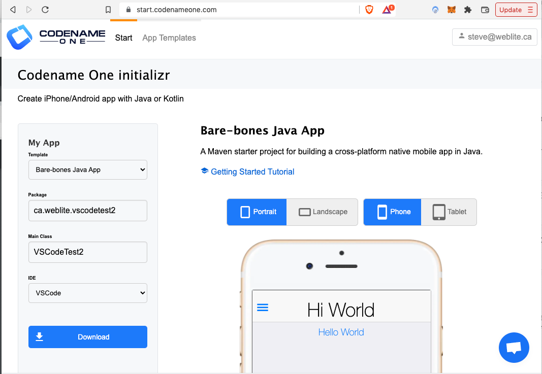 In the left panel, select the “Bare-bones Java App” template, enter a package and Main Class, and select “VSCode” in the IDE drop-down. Then press the Download button.
