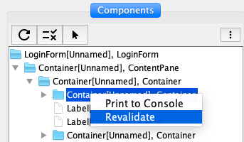 Now, you can trigger a revalidation directly in the simulator by right-clicking the container’s node in the component tree, and selecting Revalidate from the context menu.